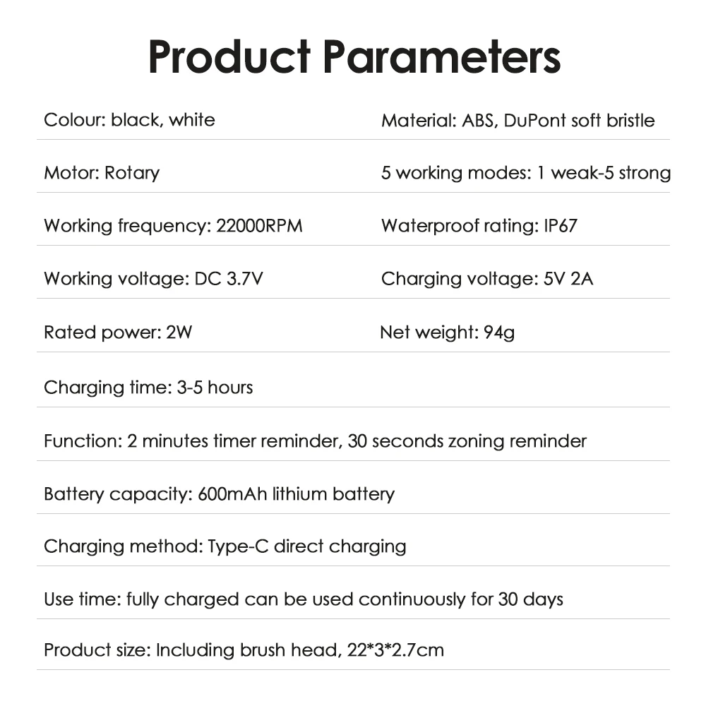 6. Type-C fast charging has a reversible connection for a quick complete charge with no distinction between positive and negative, making it convenient and efficient.7. For efficient tooth cleaning and maintenance, the operating frequency can reach 22,000 rotations per minute.