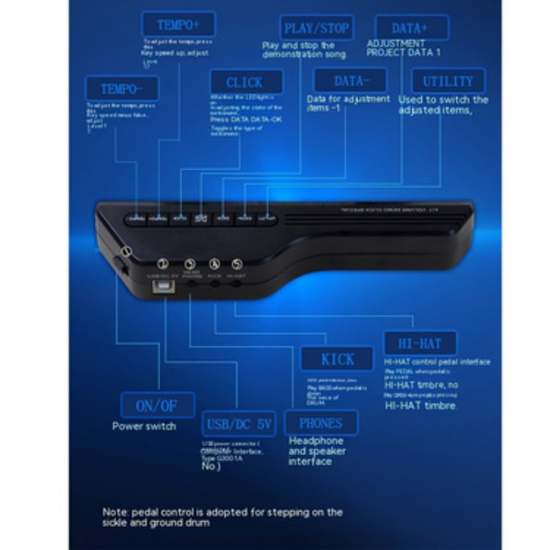 The USB cable is solely for power supply and cannot be connected to the computer for gaming purposes. 1. Authentic sound quality, replicating lifelike percussion effects. 2. Capable of playing a variety of music genres like pop, rock, Latin, electronic, and more. 3. Utilize pedal control to mimic genuine foot pedal effects, encompassing closed, open, and pedal stepping sound effects.